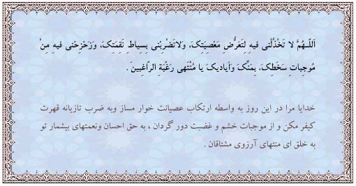 اَللّهُمَّ لا تَخْذُلْنی فیهِ لِتَعَرُّضِ مَعْصِیَتِکَ وَ لا تَضْرِبْنی بِسِیاطِ نَقِمَتِکَ وَ زَحْزِحْنی فیهِ مِنْ مُوجِباتِ سَخَطِکَ بِمَنِّکَ وَ اَیادیکَ یا مُنْتَهی رَغْبَةِ الرّاغِبینَ