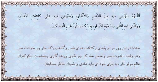«اللهمّ طَهّرنی فیهِ من الدَنَسِ والأقْذارِ وصَبّرنی فیهِ على کائِناتِ الأقْدارِ و وَفّقْنی فیهِ للتّقى وصُحْبةِ الأبْرارِ بِعَوْنِک یا قُرّةَ عیْنِ المَساکین»