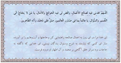 اللهمّ اهْدِنی فیهِ لِصالِحِ الأعْمالِ واقْـضِ لی فیهِ الحَوائِجَ والآمالِ یا من لا یَحْتاجُ الى التّفْسیر والسؤالِ یا عالِماً بما فی صُدورِ العالَمین صَلّ على محمّدٍ وآلهِ الطّاهِرین