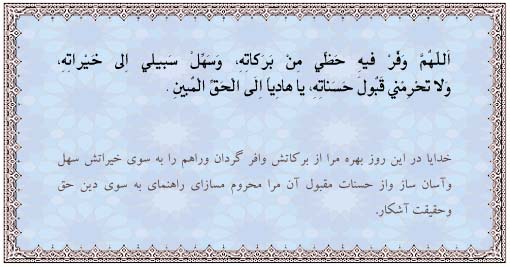 اللَّهُمَّ وَفِّرْ فِيهِ حَظِّى مِنْ بَرَكَاتِهِ وَ سَهِّلْ سَبِيلِى إِلَى خَيْرَاتِهِ وَ لا تَحْرِمْنِى قَبُولَ حَسَنَاتِهِ يَا هَادِيا إِلَى الْحَقِّ الْمُبِينِ