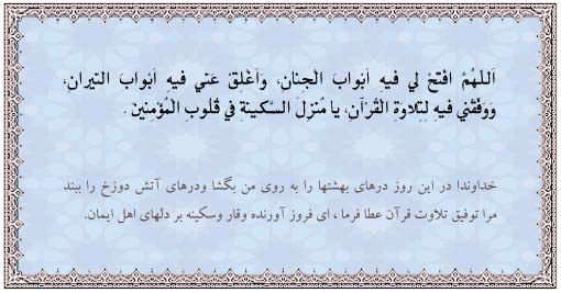 «اللهمّ افْتَحْ لی فیهِ أبوابَ الجِنانِ واغْلِقْ عَنّی فیهِ أبوابَ النّیرانِ وَوَفّقْنی فیهِ لِتِلاوَةِ القرآنِ یا مُنَزّلِ السّكینةِ فی قُلوبِ المؤمِنین»